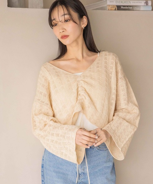 ■素材■ドライタッチのアクリルを使用し、サラッとした着心地がポイント。透かし柄にすることで柄の凹凸感があり1枚でも着映えするデザインに。■デザイン■大人気のトップスに今年らしいドロストデザインに加えにアップデートし再登場。やや短めの丈感とワイドな身幅でバランスを取りやすく着回しの効く1枚です。前後着用可能なアイテムとなっています。■スタイリング■ショート丈のアイテムなのでハイウエストボトムスとのスタイリングがオススメ。キャミワンピースの上にさらりとレイヤードしても相性良く着用いただけます。