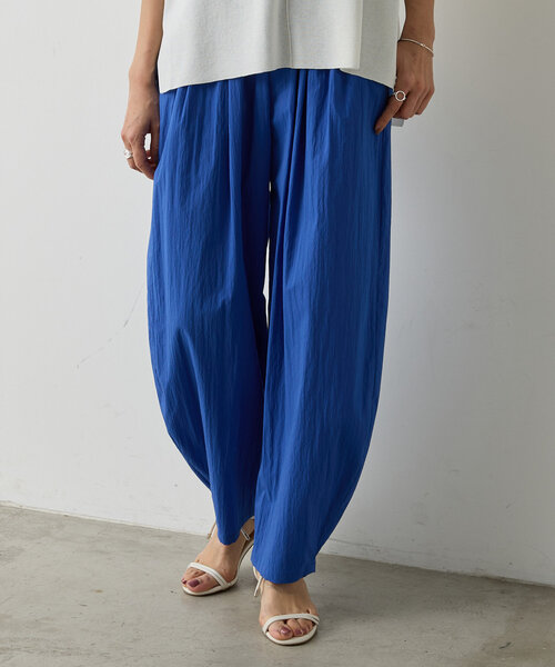 ■アイテム 裾に向かってゆるくカーブした立体感のあるパンツ。 程よい張りとシャリ感のある生地で、足のラインを拾わないのも嬉しいポイント。 ウエストはゴム仕様で、リラックスして着用いただけます。 ご自宅での取り扱いもしやすく、春夏のデイリーユースに最適な着回し力の高いアイテムです。 ▼おすすめスタイリングアイテム サラッとシリーズ リヨセルストライプシャツ ■素材・洗濯表示 素材:ナイロン50% 綿46% ポリウレタン4% 洗濯表示:洗濯機洗い(弱)可 ※液温は30度を限度とし、洗濯機で弱い洗濯処理ができる ※着用時・洗濯時は、必ず取扱い表示・タグをご確認の上、お取り扱い下さい。 -------------------------- 伸縮性:あり 光沢:あり 厚み:ふつう 透け感:なし 裏地:なし ポケット:あり ファスナー:なし -------------------------- 《お取り扱い上のご注意》 ・タンブル乾燥不可 《予約商品について》 ・サンプルの為、素材情報、洗濯表示については企画段階の情報を記載しております。公的機関での試験データ結果を受け、量産にあたり混率や洗濯方法の変更が発生する場合がございますので、ご了承くださいませ。 ・サンプルでの撮影、計測をしております。商品の仕様が一部変更になる場合がございます。 ・撮影サンプル品はブランドタグがついておりません。製品にはタグがつきますので、製品の表に縫い糸が見える場合がございます。 ・工場の生産の都合上、納期が変更になる場合がございます。検品や輸送の関係で、発送日が前後しますのでご了承ください。また、入荷状況により、お客様への発送が店頭販売より遅れる場合もございます。 ・店頭に陳列していた商品も含まれる場合がございます。 《商品画像について》 ご覧頂いている商品の写真につきましては、できるだけ実物の色に近くなるように努めておりますが お使いの環境(モニター、ブラウザ等)の違いにより、色の見え方が実物と若干異なる場合がございます。 予めご了承ください。 《ハートをタップして商品のお気に入り登録》 登録カラーの商品の「残りわずか」「再入荷」「値下げ」通知を受け取ることができます。 各ショップアプリにてブランドフォロー 新商品などの入荷情報、最新のニュースやお得な情報を受け取ることができます。