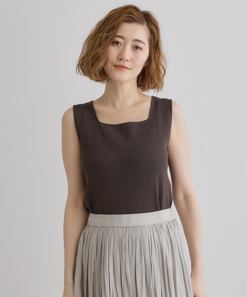 ラフにもキレイにも、着回し力◎のニットタンク 【デザイン】 前後でスクエアネックの高さを変えられるデザインが特徴のニットタンク。 シンプルでありながら、デコルテをキレイに見せてくれます。 程よい肉感で透け感もなく、見せるインナーとしても活躍します。 【素材】 肌触りがなめらかなレーヨン素材を使用。 ニット素材なので伸縮性もあり、着心地も良いです。 【スタイリング】 シャツ羽織のインナーやシアー素材のトップスのインナーとしてもおすすめ。 シンプルですっきりとしたデザインが、カジュアルからきれいめまで幅広いスタイルで楽しめます。 ※照明の関係により、実際よりも色味が違って見える場合があります。また、パソコン・スマートフォンなどの環境により、若干製品と画像のカラーが異なる場合もございます。 【25SS】 モデル情報:身長166cm B80 W59 H86 着用サイズ:02(M) 店舗へのお問い合わせ商品番号:768-12058 ●製品寸法: 01(S):着丈57cm B70cm 肩幅31cm 02(M):着丈59cm B73cm 肩幅32cm 03(L):着丈61cm B76cm 肩幅33cm 04(LL):着丈63cm B79cm 肩幅34cm 05(3L):着丈65cm B82cm 肩幅35cm 備考: