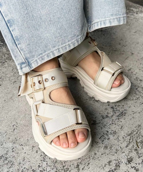 【バックルがフェミニンなボリュームソールのスポーツサンダル】 ▼Design スポーティーなスニーカーソールながらもフェミニンなデザイン! 全てのベルトが調節可能。 普段使いはもちろん、ビーチサンダルとして海やプール、BBQなどのレジャーシーンにも◎ コンパクトで軽量なので持ち運びにも適しており、旅行や遠征にもおすすめ♪ ラフに履ける楽ちんさとフェミニンさを兼ね備えたアイテムです♡ ▼Styling きれいめなワンピースやロングスカートから、カジュアルなパンツまで幅広いコーデに合わせやすいです。 ・重量:約312g(片足Mサイズ) 対応目安サイズ Mサイズ(23.5cm~24cm相当) Lサイズ(24.5cm~25cm相当) ▼Recommend ・スニーカーライク ・厚底サンダル ・ボリュームソール ・大人カジュアル ・アウトドア ・美脚 ・疲れにくい