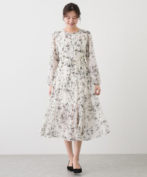 【デザイン・シルエット】 華やかさがありつつも落ち着きのあるフラワープリント生地を使用した大人な一着です。 ふんわりな揺れ感&透け感がとても女性らしく、軽やかに華やぎます。 ウエストが絞れるのでスッキリしたシルエットで着こなせます。 【素材感】 透け感のあるさらりとした素材 【カラー】 01クロ 11シロ 【スタイリングポイント】 カーディガンやジャケットインもでき、 デイリー、会食、オフィスカジュアルなど、様々なシーンでご着用いただけます。 裏地:あり 光沢感:なし 透け感:あり ポケット:なし 伸縮性:なし 生地の厚さ:普通 ボタン:あり その他仕様:ウエストリボン 季節:春秋 ※撮影時の光、お使いのモニター環境によって色の見え方が違う場合がございます。予めご了承ください。 モデル身長:172cm 着用サイズ:F