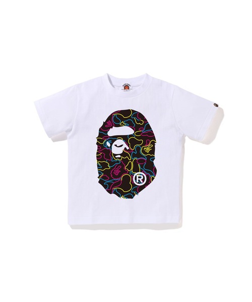 2007年に誕生したオリジナルカモフラージュ柄“NEON CAMO”を使用したアイテムが、発売開始。鮮やかな色合いとコントラストが特徴のネオンカラー。スケールを150%拡大し、より大胆な印象に仕上げました。コットン天竺を使用した着心地の良い、キッズサイズのショートスリーブTシャツ。 フロントにNEON CAMO柄のBIG APE HEADをラバープリントしたデザイン。 レギュラーフィットシルエットで、インナーにも、メイン使いにも着用可能なアイテム。