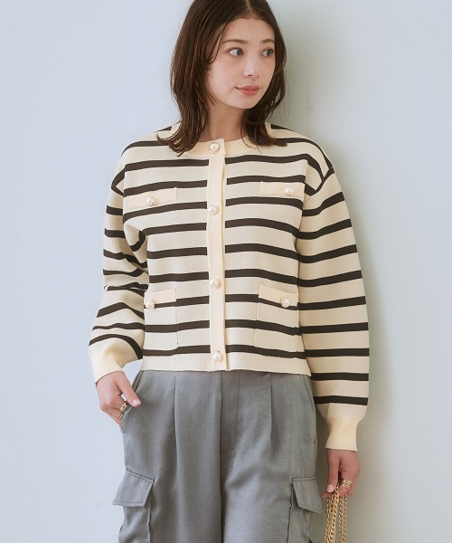 ショート丈のニットジャケットに大粒パールボタンを効かせたトレンド感のあるアイテム■デザインポケット付きのデザインでベーシックデザインにほんのり女性らしさとトレンド感を加えたアイテム。お袖はボリューム感がありドロップショルダーなので一枚でも羽織としても使いやすいサイズ感です。■素材ポリエステル100%のもっちりとしているのに軽い素材感がポイントのニット。ネットに入れて洗濯機洗いOKなのでお手入れしやすい!■おすすめのスタイリング人気のハイウエストボトムに合わせるとバランスよく着こなせます!ボタンを留めてニットトップスとして着こなすのも今年らしく手おすすめです。<仕様>ポリエステル100%(ニット)前開きボタン透け感:透けにくい伸縮性:あり生地の厚み:厚い光沢感:なし裏地:なしポケット:あり ※前2季節:春・秋シルエット:ゆったり<洗濯方法>洗濯機OK ネット使用■キーワード30代、40代、50代、60代、お出かけ、お洒落、かわいい、きれカジ、たいけいかばー、ぽっちゃり、ゆったり、アウター、アラサー、アラフォー、オフィス、オフィスカジュアル、カワイイ、シンプル、ジャケット、スマイル、スマイルサイズ、スマイルランド、デート服、トレンド、ファッション、プラスサイズ、ラージサイズ、レディース、初春、大きいサイズ、大人女子、愛され、日常使い、日常着、春、普段着、毎日、着回し、春服