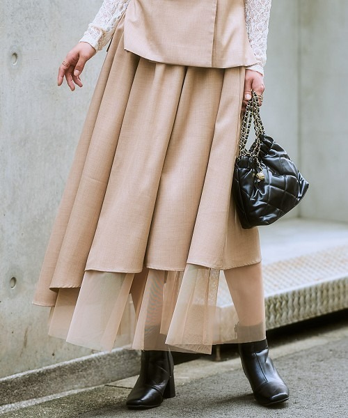アシンメトリー×チュールスカートで映えるセットアップ対応のフレアスカート ■デザイン アシンメトリーのスカートにチュールを使った大人っぽいデザインのロングスカート。 歩くたび揺れるチュールが大人のフェミニンスタイルにぴったりの一枚。 ■素材 本体は麻調合繊で仕立てており、サテン素材の裏地を使用しています。 足元にチュール生地を使用して主役級の華やかさに仕立てています。 ■おすすめのスタイリング 甘めのニットやブラウス合わせが得意なアイテム。 共通生地で仕立てたジレとのセットアップで着用すればお出かけにもピッタリのコーデが即完成します。 <仕様> [表地]ポリエステル100% [チュール地]ポリエステル100% [裏地]ポリエステル100% 後ろ総ゴム <洗濯方法> 手洗い ■キーワード 30代、40代、50代、60代、お出かけ、お洒落、かわいい、きれカジ、たいけいかばー、ぽっちゃり、ゆったり、アラサー、アラフォー、オフィス、オフィスカジュアル、カワイイ、シンプル、スカート、スマイル、スマイルサイズ、スマイルランド、デート服、トレンド、ファッション、プラスサイズ、ボトムス、マキシ、ラージサイズ、レディース、ロング、初春、大きいサイズ、大人女子、愛され、日常使い、日常着、春、普段着、毎日、着回し、春服