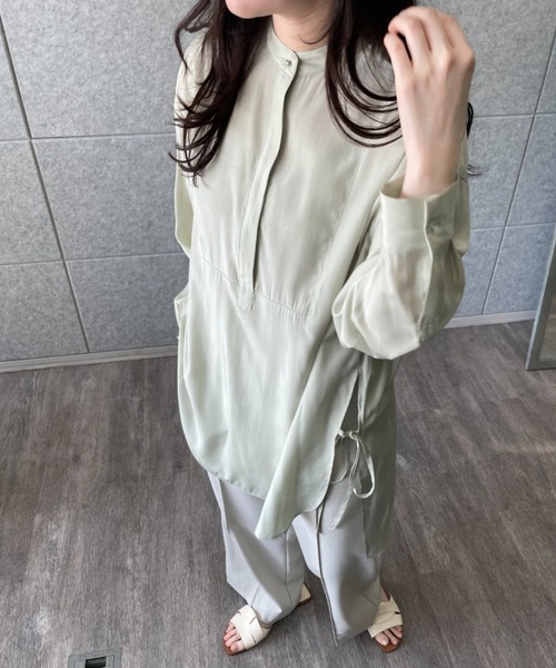 程よい光沢感の女性らしさが特徴のチュニックブラウス 【デザイン】 ・オーバーシルエットとロング丈が大人の余裕を感じさせる落ち着いた印象。 ・サイドリボンのディテールが女性らしいアクセントになり、着こなしに変化をプラス。 ・シンプルながらも袖や背面の繊細なタックが動きのあるシルエットを演出。 【素材】 ・柔らかさと適度な光沢感を持つしなやかな素材。 ※ウォッシャブル加工(手洗い可) 【着こなしポイント】 ・細身のパンツを合わせて、こなれ感のある大人カジュアルスタイルに。 ・シンプルなタイトスカートと合わせることで上品なフェミニンルックが完成。 ーーーーーーーーーーーーーーーーーーーーーーーーーーーーーー 気になるアイテムはお気に入り登録がおすすめ! お気に入り登録で、再入荷通知やお値下げ情報をお知らせ。 お得な情報をいち早くお届けいたします! アイテムページにある、ハートマークをクリックして追加できます。 ーーーーーーーーーーーーーーーーーーーーーーーーーーーーーー ※照明の関係により、実際よりも色味が違って見える場合があります。また、パソコン・スマートフォンなどの環境により、若干製品と画像のカラーが異なる場合もございます。 店舗へのお問い合わせ商品番号:R91-82008 ●製品寸法: 02(M):着丈85cm B127cm 袖丈50cm 肩幅57cm 備考: