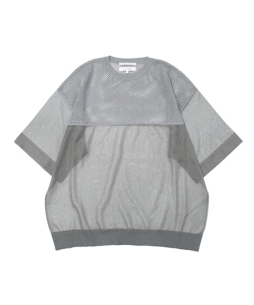 和紙混の糸をメッシュ編みにし、透明感のある繊細な糸を使用したシアー素材ををドッキングさせた、半袖プルオーバーニット。 ・メッシュ部分には吸湿性と保湿性の両方の特性を兼ね備えた和紙混の糸を使用。 天然に備わった撥水機能と抗菌性があり、超軽量という高機能な天然素材。 ・シアー部分は非常に軽量でハリ感があり上品な印象に。 ・全体的に透け感のある、今年らしいデザイン。