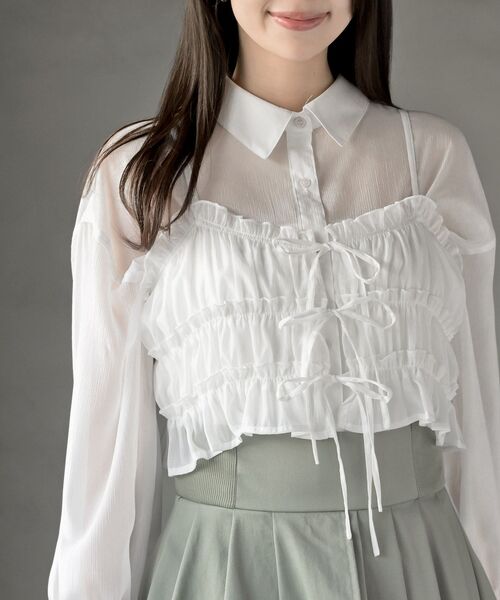 ☆2026/SS 再入荷☆ ガーリーなビスチェがついたシアーシャツ シンプルなシアーシャツにキャミソールビスチェがついたセットアイテム。 ほんのり光沢のあるシーア素材がこなれ感のあるコーデを演出します。 ビスチェはクシュクシュとしたガーリーなシャーリングデザイン。 フロントはリボンをあしらって女性らしいスタイリングに仕上げてくれます。 シャツのインにしたり、アウトでレイヤードスタイルを楽しんだり、前後で着まわしたり、あれこれ使えるビスチェ。 シャツはほかコーデでも使いまわせるベーシックなデザインになっています。 お得感いっぱいのセットアイテム。 裏地なし 伸縮性なし 薄手 ポケットなし (シャツ) 前開きボタン留め 袖口ボタンあり (ビスチェ) ゴム仕様 前(後)開きリボン結び 肩紐アジャスターあり 洗濯:手洗い可 ※再入荷の場合、生産時期が異なるため色・素材・サイズ・デザイン等多少異なる場合がございますので予めご了承ください ▼お気に入り登録でお得がいっぱい▼ ~商品をお気に入り登録~ 再入荷・ラスト1点などの通知を受け取ることができます! ~ブランドをお気に入り登録~ 《rps》の新商品・再入荷情報をいち早くお届け!