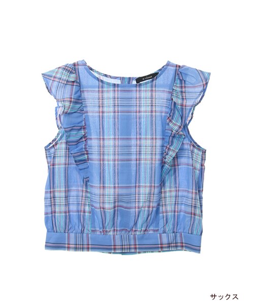 薄手綿100%の涼しい生地とチェック柄が可愛いトップス。肩フリル切替がポイントです。トレンドのワイドパンツとの相性もよいです。