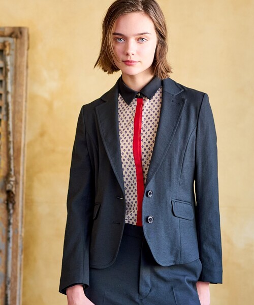 《多機能な麻ブレンド素材を採用!人気のスタイルアップ、ストレッチジャケット》●軽くて清涼感のある多機能麻ブレンド素材を採用●美しいシルエットと快適な着心地を両立●総パイピングで見えないところも丁寧に●セットアップからカジュアル使いまでできる万能ジャケット●こだわり人気のシングルブレスとジャケットを、より美しいシルエットと快適な着心地を目指してブラッシュアップ。やや短めの着丈感とすっきりさせたウエストラインにすることでスタイルアップを狙っています。襟やフラップポケットまわりにステッチワークを施し、背裏にアイコンのオーバーラップサークルを取り入れるなど、見えない部分までこだったジャケットです。●素材素材には今季特注の多機能素材を採用。麻ブレンド素材でありながらシワをそこまで気にする必要がなく、軽く着ていただけるのが特徴。また、吸水速乾、接触冷感、UVカット、ストレッチ性に加え、白でも透けにくいシェルタリング機能も兼ね備えた、特別な素材です。こちらの商品にはセットアップのパンツがございます。品番:085-62013【仕様】・ポケット数:横×2・裏地なし※この製品は、太陽光線中の紫外線(UV)を通しにくくします。この効果は永久的ではありません。※この製品は、吸水速乾効果のある素材を使用しています。この効果は永久的ではありません。※照明の関係により、実際よりも色味が違って見える場合があります。また、パソコン・スマートフォンなどの環境により、若干製品と画像のカラーが異なる場合もございます。モデル情報:身長168cm B80 W59 H87 着用サイズ:38(M) モデル情報:身長168cm B80 W59 H87 着用サイズ:38(M) 店舗へのお問い合わせ商品番号:085-42012 ●製品寸法: 34(SS):着丈51cm B90cm 袖丈57cm 肩幅37cm 36(S):着丈53cm B93cm 袖丈58cm 肩幅38cm 38(M):着丈54cm B96cm 袖丈59cm 肩幅39cm 備考:重量:約390g(サンプルサイズ)