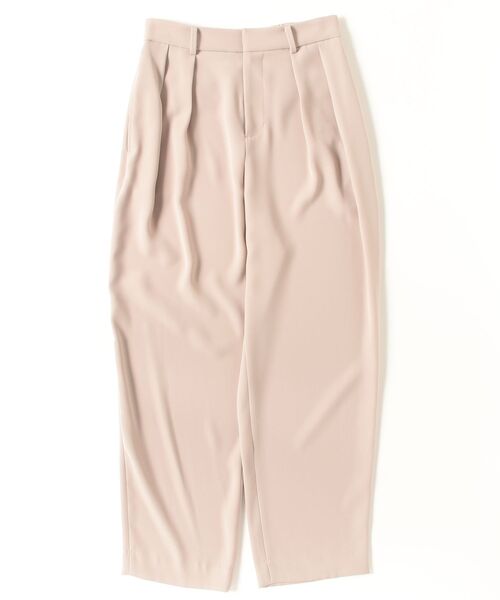 《デザイン》 しなやかでほど良いドレープ感のあるツイル素材を使用したツータックパンツです。 ウエストはタックで分量感を出し、裾に向けて絞った丸みのあるシルエットは、足のラインをひろいにくく、すっきりとして見えます。 後ろをゴム仕様にすることで、フィット感がありながらもリラックスした履き心地です。 タックのボリュームでトレンド感を際立たせたスラックスパンツです。 《素材》 適度なはりのある滑らかな質感で、伸縮性にも優れているツイル素材です。 ふくらみのある二重織りなのでしわになりにくく、下着や体のラインを拾いすぎにくいのが特長です。 〇お手入れ方法:手洗いOK