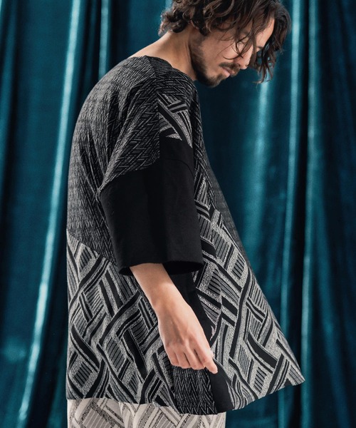 181cmのモデルがMサイズを着用。 2つの柄生地と無地でブロッキングデザインを施したT-shirtです。 パターン・オン・パターンのエッジの効いたデザイン。 個性的なデザインが存在感のあるコーディネートを作り出す1着。 柄箇所はジャガード編みのカットソーを、無地箇所はミニ裏毛カットソーを使用しています。 ドロップショルダー、ワイドな身幅、ゆとりのある袖周り設定のたっぷりとしたリラックスシルエットです。 ※着用画像と商品単体画像で色が異なる場合がございます。 ※商品単体画像を実物により近づけております。
