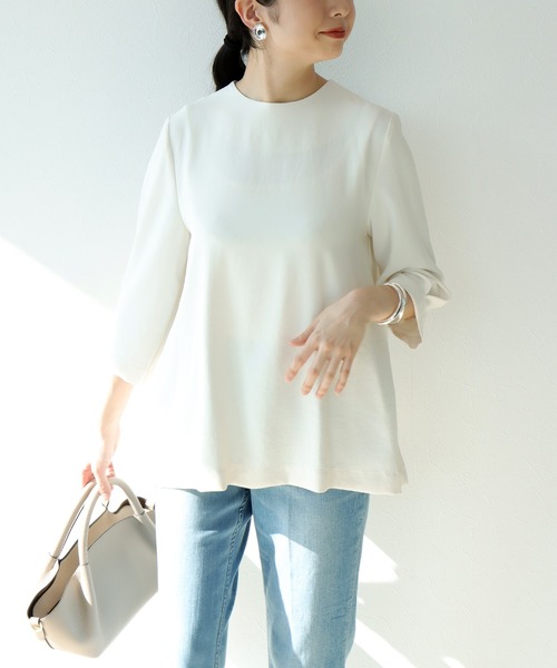 バックパールAラインブラウスエレガントで女性らしいバックスタイルが特徴のAラインブラウス。背面にあしらわれた上品なパール装飾が、後ろ姿に華やかなアクセントを加えます。ふんわりと広がるAラインシルエットが体型をさりげなくカバー。デイリーからオケージョンまで幅広いシーンで活躍する1枚です。--------------------------------------透け感:なし(※ホワイトややあり)裏地:なし伸縮性:なしケア方法:手洗い可※お洗濯の際は洗濯表示を必ずご確認ください。--------------------------------------