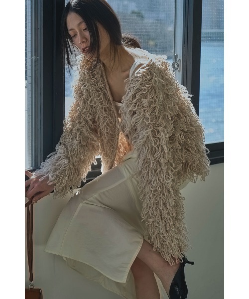 2色の糸を組み合わせたミックスカラーのループ編みニット。表面感によるボリュームはあるもののとても軽い着心地。プレーンなニットカーディガンと違いTシャツやスカート、パンツのワンツーコーデ的なミニマルなアイテムに合わせるとポイントになってくれます。ロゴTEEやプリントTEEとも相性がよく、ボトムにカラーを持ってきたとしても中和してまとめてくれます。2色ともそれぞれホワイトとのミックスカラーなのでスタイリングする上で重さが出にくいのも。季節の変わり目に特に活躍してくれるアイテムです。※こちらのアイテムは数量限定販売ですので売り切れ次第販売終了となります。[着用時期]10〜3月(約15℃以下)[透け感]なし[生地の厚み]中肉[ストレッチ]あり[生地のやわらかさ]やわらかい[生地の特徴]2色の糸をループさせているニット[落ち感]なし(ふんわりしたシルエット)[着用ジワ]なりにくい[身長]全ての方に(身長によって着丈が変わります)※感じ方には個人差がございますので気になる部分がありましたらお気軽にお問い合わせください