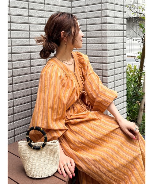 鮮やかなカラーリングの、マルチカラーのストライプ生地を使ったデザインワンピース ■デザイン 夏らしくヘルシーなデザインを落とし込みしています。 フロントはレースアップ仕様でアクセントを。 スリーブにはたっぷりのボリューム感でビーチっぽさを。 ウエストは少しシェイプすることでスタイルもメリハリのあるサイジングです。 ■生地感 インド綿を使用しているので夏でも涼し気に着て頂けます。 透け感も気にならず着用頂けます。 ■サイズ感 たっぷりとしたボリューム感があるのでルーズに着て頂けます。 着丈はマキシ丈でフラットシューズでも合わせて頂ける設定です。 ■スタイリング 1枚でヘルシーに着て頂くのがオススメ。 雑材の小物との相性も良いので夏らしくまとめるとお洒落な印象に。 レースアップの部分を緩めてスカートとしてアレンジして着て頂くのも可能です。 ・・・・・・・・・・・・・・・・・・・・・・ 透け感:なし 裏地:なし 伸縮性:なし 光沢感:なし 生地の厚さ:普通 ・・・・・・・・・・・・・・・・・・・・・・ ※商品画像はサンプルのため、色味やサイズ、素材の混率等の仕様に 変更がある場合がございます。予めご了承ください。 ※生地寄り画像を正規の商品の色味に近づけております。 ■商品のお気に入り登録 再入荷通知やラスト1点、お得なプライスダウンの情報も受け取ることができます。 ぜひご登録ください◎