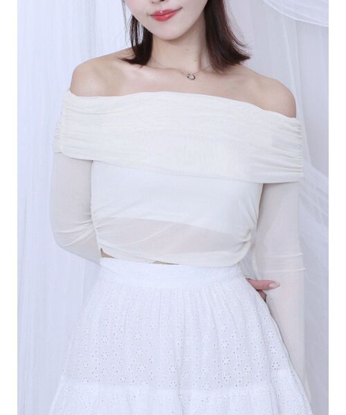 ギャザーたっぷりのオフショルダーデザインが大人フェミニンムードを高めるトップスです。透け感のあるメッシュ生地は女性らしさをプラスしつつ、伸縮性抜群でストレスフリーに着用できます。 身頃はしっかりと裏地が付いているので、インナーが透ける心配無しです。 ミニスカートに合わせるのはもちろん、デニムパンツに合わせたキレイ目カジュアルコーデがオススメです。 ---------------------------------------------- ♡商品のお気に入り登録 完売カラーの再入荷通知や、ラスト1点、セールの通知をお知らせ致します。 ♡ブランドお気に入り登録 新商品や再入荷など、いち早くブランドの情報を受け取ることができます。 ---------------------------------------------- ※サイズは、実寸サイズを測っているため多少誤差がでる場合があります。 ※重量は目安として、参考にして下さい。 ※商品画像は着用イメージです。 光や角度により、実物と色味が異なる場合がございます。 商品の撮影はサンプルで行っている為、カラーやサイズ等に変更がある場合がございます。 ご覧のモニター環境により実際の商品と多少色味が異なって見える場合がございます。 ご了承ください。 ※他のキャンペーンにより、期間中に価格が変動する場合があります。 ※セールは予告なく終了させていただく場合もあります。