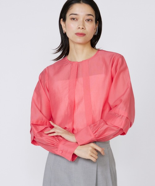 シルクのように上品な光沢感のある軽やかな素材のタックブラウス。襟元のと袖にタックを施し、自然な立体感が引き立つシルエットです。ウエストイン・アウトを選ばずバランスが整う1着。しなやかさの中に適度なハリ感があるため、美しいシルエットを保ちながら、ジャケットやブルゾンのインナーとしてもコーディネートが楽しめます。・水洗い可■サンプル撮影商品■こちらの商品はサンプルでの撮影となっております。実際の商品とは、サイズや色味、素材、デザイン等の仕様が若干変更になる場合がございます。