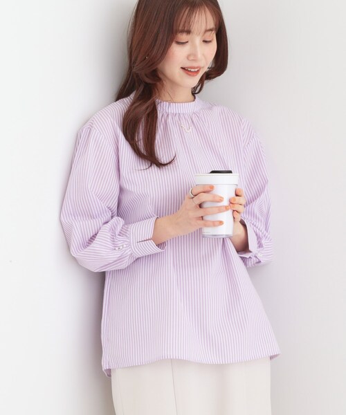 デイリーに活躍する大人フェミニンブラウス 【デザイン】 お袖口にタックデザインを入れた腕周りがキレイに見えるブラウスです。 ラウンドネックとギャザーデザインがお顔まわりをスッキリと見せてくれます。 ストライプ柄3色とマルチストライプ柄3色の6色展開です。 【スタイリング】 デイリーにデニム合わせはもちろん、ボトムにINしたきれいめスタイルにもオススメです。 体のラインを拾いにくいリラックスシルエットで、スタイリングの幅も広がるアイテム。 ボトムスにインしなくてもスタイルが決まるのも嬉しいポイントです。 【素材】 柔らかく着心地のよいポリエステル・コットン素材を使用しています。 洗濯後にシワになりにくいので、お家でのお手入れが楽ちんなイージーケア機能付き。 ※照明の関係により、実際よりも色味が違って見える場合があります。また、パソコン・スマートフォンなどの環境により、若干製品と画像のカラーが異なる場合もございます。 モデル情報:身長168cm B82 W59 H85 着用サイズ:02(M) 店舗へのお問い合わせ商品番号:741-82013 ●製品寸法: 01(S):着丈62cm B107cm 袖丈49cm 肩幅47cm 02(M):着丈63cm B110cm 袖丈50cm 肩幅48cm 03(L):着丈64cm B113cm 袖丈51cm 肩幅49cm 04(LL):着丈65cm B116cm 袖丈52cm 肩幅50cm 備考: