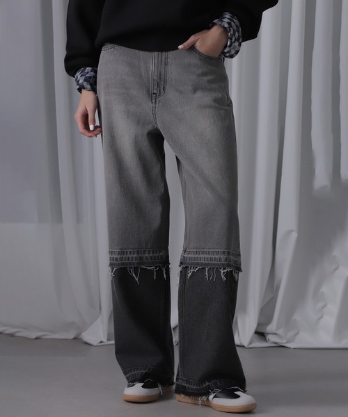 一枚でもインパクトのある仕上がりの裾パネルストレートデニム・膝上と膝下で加工感を変えた中肉のデニム生地・ウエストはゆったりと腰に下げて履けるサイズ感・ブラック、ブルーの2色展開【商品特性】生地の厚さ:普通透け感:なし伸縮性:なし光沢感:なし裏地の有無:なしウエストのゴム仕様:なし着用シルエット:オーバーポケット仕様:本開き【スタッフレビュー】膝下から加工感を変えた裾パネルのストレートデニム。ウエストはゆったりと腰に下げて履けるサイズにしていて、ローウエストで履いてもらうのがお勧めです。盛夏にはコンパクトサイズのTシャツ等と合わせてもらうとメリハリのあるトレンドスタイリングになります。膝下から加工感を変えて切り替える事で、濃淡の差があり、一枚でもインパクトのある仕上がりに。ブラックはオーバーダイでベージュの色味を入れていて、よりヴィンテージ感があります。【お気に入り登録】♡商品のお気に入り登録♡再入荷・残り1点・セールの通知を受け取ることができます。♡ブランドのお気に入り登録♡新商品・再入荷/・ショップおすすめトピックスなど、ブランドの情報を受け取ることができます。【取扱注意事項】モデルの着用画像の場合、光の当たり具合により、実際の色味と異なって見えることがございます。色味は、商品生地の画像をご参照ください。