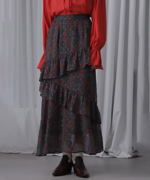オリジナルプリントを施したエアリーで軽やかなフリルスカート・透け感のあるラメドットのドビー生地にオリジナルのプリント・アシンメトリーに付けた大きなフリルデザイン・ブラウン、グリーンの2色展開【商品特性】生地の厚さ:薄手透け感:あり伸縮性:なし光沢感:あり裏地の有無:ありウエストのゴム仕様:あり着用シルエット:レギュラー【スタッフレビュー】透け感のあるドビー生地にオリジナルプリントを施したスカート。エアリーで軽やかな生地感は足をさばくたびにふんわりと動きが出ます。アシンメトリーに付けた大きなフリルも華やかな印象に。甘くなりすぎない少し毒気のあるカラーが入っているのもオリジナルプリントならでは。ロックTやトラックジャケット等と合わせてミックスコーデを楽しんだり、シンプルなトップスに合わせて柄を際立たりいろいろな着こなしが可能です。【お気に入り登録】♡商品のお気に入り登録♡再入荷・残り1点・セールの通知を受け取ることができます。♡ブランドのお気に入り登録♡新商品・再入荷/・ショップおすすめトピックスなど、ブランドの情報を受け取ることができます。【取扱注意事項】モデルの着用画像の場合、光の当たり具合により、実際の色味と異なって見えることがございます。色味は、商品生地の画像をご参照ください。