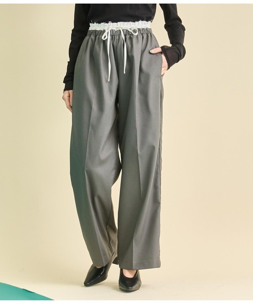 細かく入ったピンストライプが上品な印象のスラックスパンツ。●切りっぱなしのダブルウエストが特徴の一枚。●センタープレスで縦のラインが強調され、スタイルアップ効果も期待できます。●トップスをインしてウエスト部分のデザインを見せたスタイリングがオススメ◎●落ち着いたカラーとデザインでオンオフを限定せずに使える万能アイテムです。※ストレッチなし※裏地あり※ポケットあり※ウエストゴムあり※ウエスト紐で絞れます※商品のお取扱いに関しましては、商品に付属のアテンションカード、洗濯ネームをご覧ください。※モデル着用画像は光の当たり具合で色味が違って見える場合がございます。※商品の色味の目安は、商品単体の画像をご参照ください。【お買いものをお楽しみいただく為に!】▼商品のお気に入り登録完売カラーの再入荷通知や、ラスト1点の通知、セールの通知も受け取ることができます。▼ブランドのお気に入り登録新商品や再入荷など、いち早くブランドのお得な情報を受け取ることができます。