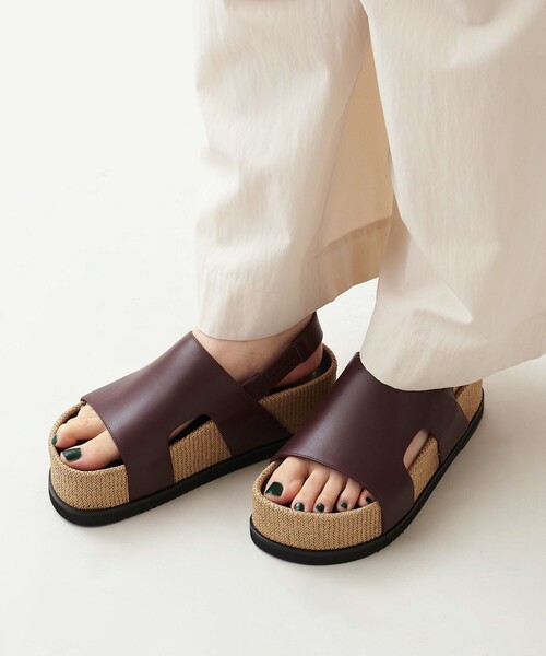 軽やかさとボリューム感を両立するサンダル ■デザイン ボリュームのあるプラットフォームが特徴のカバードサンダルです。 足入れ部分には少しゆとりを持たせ、バックストラップもフィットしすぎず、歩く時の快適さを追求しました。 プラットフォームにはラフィア風の素材を使用し、春夏らしい軽やかな印象を与えます。 ■素材 本革を使用。 アッパーにはスムース素材を使用。 プラットフォームにはラフィア風の素材を巻き、ナチュラルな雰囲気をプラス。 金具は薄いゴールドカラーで統一し、デザイン全体にまとまりを出しました。 ■コーディネート プラットフォームの厚みがあることで、ヒールを合わせていたようなワイドパンツとも好相性。 フェミニンカジュアルなワンピースと合わせるのもおすすめ。 季節感をさりげなく取り入れられて、長いシーズン履きやすいサンダルです。 【注意事項】 ※画像の商品はサンプルです。 ※商品画像は、光の当たり具合やパソコンなどの閲覧環境により、実際の色味と異なって見える場合がございます。あらかじめご了承ください。 ※シューズの重量は、シューズ本体のみ両足の重量となります。箱や付属品は計測に含まれません。 ※商品に不良が無い場合、包装紙および箱の破損がございましても発送いたします。あらかじめご了承ください。 店舗へお問い合わせの際は、全国のODETTE E ODILE各店舗まで下記の品名/品番をお申し付けください。 品名:OF ボリュームプラットフォーム SD60 品番:45141990013