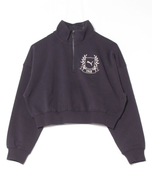コットンの裏毛素材を使用したハーフジップトップ。オーバーサイズのショート丈が今のスタイルにぴったりのシルエット。左胸にはFOOTBALLの雰囲気を演出するriginal emblem LOGO patchを使用。