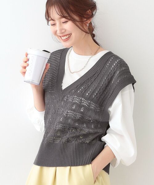 【デザイン】パッチワーク風の編地がポイントのニットベスト。4つの表情の違う編地で構成されています。【スタイリング】ロンTやシャツなどを中に着たレイヤードスタイルがおすすめです。短めの着丈なので、インナーを長めの物と合わせてもバランスがとりやすいデザインです。ワイドパンツはもちろんですが、テーパードパンツですっきりと見せることもできます。【素材】ドライタッチなアクリル糸を使用したニットです。※照明の関係により、実際よりも色味が違って見える場合があります。また、パソコン・スマートフォンなどの環境により、若干製品と画像のカラーが異なる場合もございます。#CutieBlonde#Cutie#cutieblonde#cutie#キューティブロンド#キューティモデル情報:身長168cm B82 W59 H85 着用サイズ:00(FREE)店舗へのお問い合わせ商品番号:256-22003●製品寸法:00(FREE):着丈54cm B98cm 肩幅52cm備考: