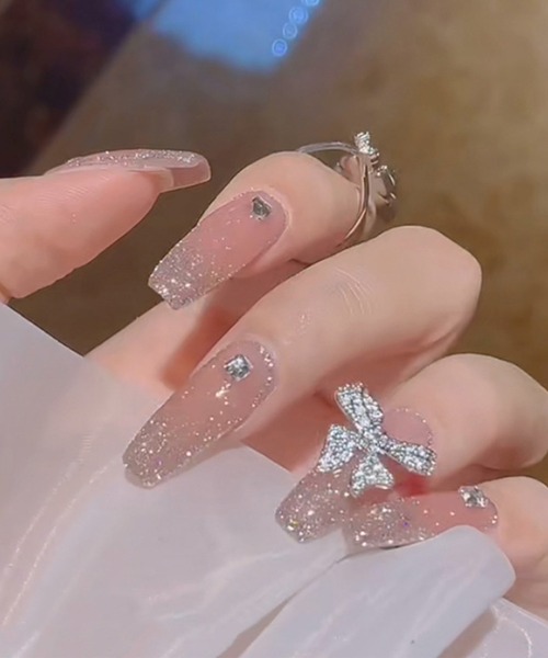 指先を華やかに彩る、ネイルチップのバラエティセット。 オシャレなスクエアフォルムに、パールやリボン、ビジューなどの3Dモチーフをのせることで、存在感たっぷりに仕上げました。 簡単にセットができるシールタイプで、不器用さんでも安心してお使いいただけます◎ その日限りでオフができるので、医療関係や学生など、普段ネイルアートを控えたい方にもおすすめです。 それぞれにデザインの異なる、6パターンでご用意いたしました。 【セット内容】 ・ネイルチップ 24枚 ・粘着シール 24枚 ・ネイルファイル 1個(色ランダム) ・ウッドスティック 1個(色ランダム) ■使用方法 ①消毒用エタノール等で爪の油分や汚れをふき取る ②粘着グミタイプ:適切なサイズの粘着グミを爪に貼り、表面フィルムを剥がす グルータイプ:ネイルチップの裏側に適量にグルーを塗る ③爪の根元からネイルチップを付ける ④20秒ほど押さえてフィットさせる ■長持ちの秘訣 ・ネイルチップを貼る前に、反射点やグリースがなくなるまでネイルファイルで爪を磨きます。 ・爪よりも少し小さめのネイルチップをお選びください。 ・粘着グミが温かいと粘着性が高くなります。寒い時期はドライヤーなどで温めてからご使用いただくとより効果的です。 ・ネイルチップと爪の間の空気を抜くように指でギュッと押さえると、さらにしっかりと密着します。 ・効果を長持ちさせるため、粘着後2時間は水に触れないようにしてください。 ■外し方 ウッドスティックを自爪とチップの間に少しずつ差し込み、ゆっくりと剥がしてください。無理やり剥がすと爪が痛む原因となります。 ※剥がしにくい場合は、外す前に指をぬるま湯に5~10分程浸すか、ウッドスティックにオイルなどを含ませてから行うと効果的です。 <注意点> ・色合いはモニター環境により若干の誤差が出ます。 ・サイズは測り方により若干の誤差が出る場合がございますが、予めご了承ください。 ・入荷・生産時期により、色、サイズ、素材など多少異なる場合がございます。