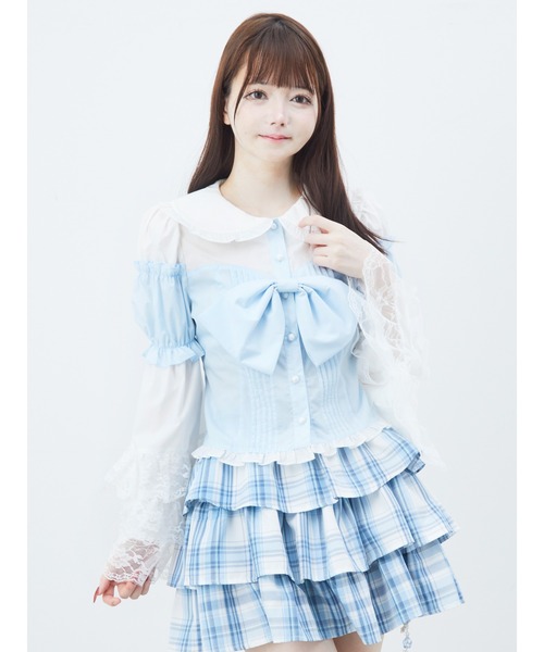 point▼フロントの大きなリボンのお姫様のようなお袖のブラウス。フロントリボンは取り外し可能です。大きいおリボンなので、バストアップの自撮りがとってもかわいくなる魔法のブラウス。 coordinate▼ふわふわのティアードスカパンがおすすめです。 リボン取り外し可