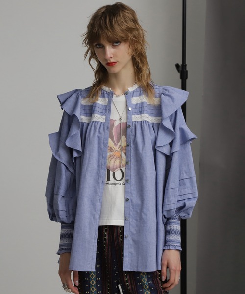 メンズライクな素材でロマンティックに仕上げたシャンブレーフリルシャツ ・デニム見えする縦糸と横糸で色差のあるシャンブレー生地を使用 ・肩と袖にふんだんにフリルを施した甘さのあるデザイン ・バストから裾に掛けて広がるフレアデザイン ・ブラックとブルーの2色展開 【商品特性】 生地の厚さ:普通 透け感:なし 伸縮性:なし 光沢感:なし 裏地の有無:なし 着用シルエット:オーバー 【スタッフレビュー】 羽織にもなるシャンブレーフリルシャツ。 デニム見えする縦糸と横糸が色差のあるシャンブレー生地を使用。 肩と袖にふんだんにフリルを施し、衿や胸には配色のコットントーションレースを施しました。 袖口には2配色のスモッキングを施し、とことんロマンティックに仕上げました。 素材はメンズライクなので甘くなり過ぎないのもポイントです。 バストから裾に掛けてフレアを入れ広がるデザイン。 オーバーサイズで前開きなので羽織として使用するのもおすすめです。 mag.by c 「自由なスピリットを纏った新時代のヒッピースタイル」 装いを通して感じる高揚感、洋服がもたらすポジティブなエネルギー。 プレイフルな気持ちで「私の好き」を形にしていきます。 鮮やかな色彩・クラフト技術を取り入れた多国籍なカオスさ、 そして都会的でモードな一面を共存させたブランドです。 【お気に入り登録】 ♡商品のお気に入り登録♡ 再入荷・残り1点・セールの通知を受け取ることができます。 ♡ブランドのお気に入り登録♡ 新商品・再入荷/・ショップおすすめトピックスなど、ブランドの情報を受け取ることができます。 【取扱注意事項】 モデルの着用画像の場合、光の当たり具合により、実際の色味と異なって見えることがございます。 色味は、商品生地の画像をご参照ください。