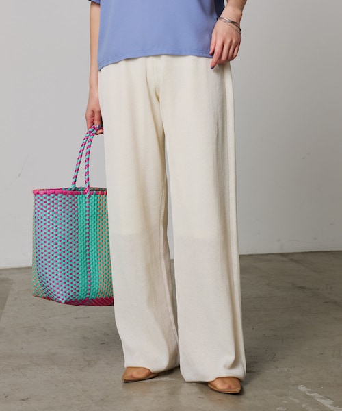 程よいシアー感のあるニットリブパンツ【POINT】・適度なワイドシルエットは体の線を拾わずにストンと落ちて、スッキリしたシルエットが美しいニットパンツ。・膝位置まで裏地を付けているので、ひざ下の程よいシアー感をお楽しみください。・ウエストはゴム仕様と内側の紐で調節は可能◎・ラメ糸を使用しており、イージーパンツながら上品な印象に。【おすすめコーディネート】キレイめブラウスと合わせてリラックス感のある夏のよそゆきスタイルもおすすめです。【おすすめのスタイリングアイテム】・ハーフスリーブジョーゼットTシャツ CLZ10A2206A0007・ハーフスリーブポンチ切替Tシャツ CLZ1051406A0003【素材】本体: ポリエステル100% 裏地: ポリエステル100%透け感:ややあり裏地:膝下まであり伸縮性:あり光沢感:なし洗濯:手洗い可25SS【気になる商品は「お気に入り」登録を】ハートマークをクリックし、お好きなカラーを選んでお気に入りに登録すると入荷情報や残り1点の通知、完売カラーの再入荷、セール情報などを受け取ることができます。※撮影場所やお使いのモニター環境により若干お色味が異なる場合がございます。特にロケの撮影では明るく見える傾向にございます。詳細撮影画像で色味をお確かめくださいます様お願いいたします。※サンプルで撮影をしております。若干の仕様が変更になる場合がございますので予めご了承の上ご注文くださいますようお願いいたします。※サンプルでの採寸のためあくまで目安となります。予めご了承ください。
