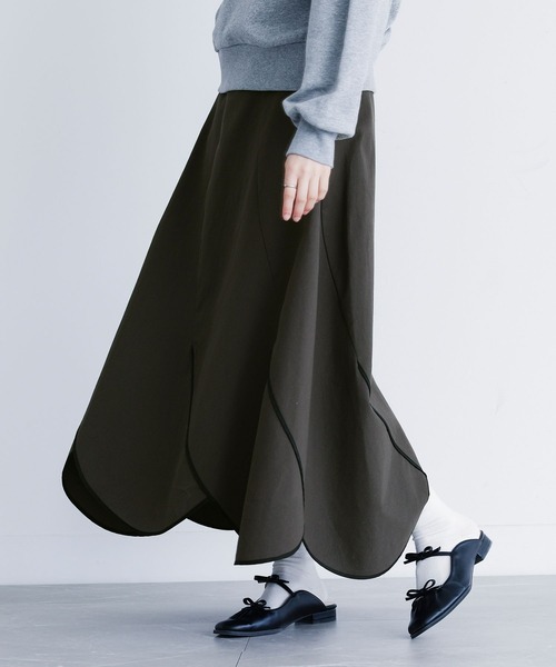 ■デザインカーブ切り替えのデザインが立体感を生み、動くたびに表情が生まれるスカート。ベルト下と裾付近にを施したパイピングがポイントの、優雅に広がるフレアシルエットが魅力的な一枚です。■コーディネートシンプルなトップスを合わせて、スカートのデザインを引き立てる着こなしがバランスよく決まります。コンパクトなニットやタートルネックと合わせれば、上品で女性らしい印象に。カジュアルに着こなすなら、ロゴTやスウェットを合わせて抜け感をプラスするのもおすすめです。■素材コットン100%でしっかりとした質感のツイル生地を使用。厚すぎず薄すぎない程よい厚みなので、オールシーズンでご着用いただけます。パイピング部分には滑らかなサテン生地を使用しており、さりげない異素材デザインがポイントになっています。