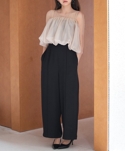 パーティーに活躍するオーガンジートップスとオールインワンの2点セット。 ■見せ方自由自在の3way仕様 トップスの上端ゴム仕様で3wayの着こなしができます。オフショルダー・ワンショルダー・ベアトップスの3wayで雰囲気を変えられます。 ■締め付け感ゆるめのバックウエストゴム バックウエストはゴム入り。ウエスト周りを締め付けず、楽な着心地を与えながらスタイリッシュなパーティーコーデができます。ファスナーと涙開きで着脱も楽。 ■体型カバーができるワイドシルエット ワイドシルエットなので体のラインを拾わず、体型カバーにも◎ ほどよく広がるワイドが大人ラインをつくります。 ■華やかなシーンにぴったり 3wayのオフショルダートップスを変化させることで華やかなシーンにぴったり。オーガンジーならではのふんわり広がるデザインが華やかです。
