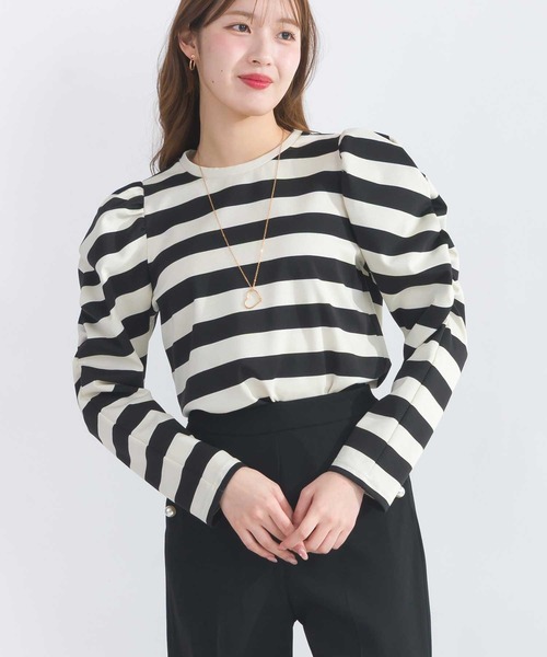 袖のギャザーが目を惹く大人フェミニンなボーダーカットソー。コットンブレンドなので肌触りが良く、さらっとした生地感。ストレッチ性があり程よくフィットするシルエットが、女性らしいラインを引き立ててくれます。シンプルなボーダーにたっぷりのギャザーを採用することで華やぐ1枚。カジュアルさと大人レディを両立したアイテムです。フレアやワイドなボトムスとの相性はもちろん、ウエストインしやすい丈感でスタイルアップにも期待できます。オフホワイト×ブラックアイボリー×ブラック※3×3cm幅ボーダー【詳細情報】厚み:□薄手 ■ふつう □厚手透け感: ■なし □あり光沢感: ■なし □あり伸縮性: □なし ■あり裏地: ■なし □ありポケット:■なし □あり重量: 約250g※撮影場所や明るさにより実際の商品と色味が若干異なる場合がございます。 ☆商品のお気に入り♡登録を押せば”再入荷通知”や”残りわずか通知” 値下げのお知らせが届きます!お気に入りのブランド登録していただければ新商品入荷のお知らせも届きますので是非登録してみて下さい。