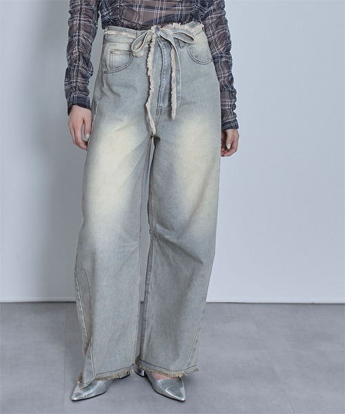 トレンド感満載のオーバーダイ加工を施した、ヴィンテージ風のデニムパンツ。美脚を演出するカーブシルエットと、ウエストのフリンジ紐がスタイリングを引き立てるアクセントに。■Point・オーバーダイ加工:ヴィンテージ感を演出する、トレンドのオーバーダイ加工で、独特の風合いと色合いが魅力的。・立体的カーブシルエット:ワイドなデザインながら、美脚を引き立てる立体的なカーブシルエットで、スタイルアップ効果あり。・オールシーズン着用可能:程よい肉厚でハリ感のあるデニム素材は、季節問わず活躍できるアイテム。・ウエストフリンジ紐付き:共地のフリンジ紐がウエストに付いており、取り外し可能でスタイリングに合わせて変化を楽しめます。・裾とフリンジがアクセント:裾部分とウエストのフリンジデザインがポイントとなり、シンプルながら他のデニムと差がつくデザインに。■Coordination・カジュアルスタイル:Tシャツやスニーカーを合わせて、リラックスしたカジュアルなコーディネートに。・キレイめスタイル:ブラウスやヒールと合わせて、大人っぽくシンプルに仕上げるコーディネートもおすすめ。・レイヤードコーデ:ロング丈のトップスやオーバーサイズのシャツとのレイヤードスタイルで、バランスの取れたシルエットを楽しんで。トレンド感とヴィンテージ風な雰囲気を取り入れつつ、個性的なデザインのデニムパンツで、コーディネートの幅が広がります!※当商品は機械による生産の過程上、どうしても"生地を織る際の糸の継ぎ目"や多少の"ほつれ"、他繊維の"混紡"、また、形やサイズや柄に多少の"誤差"が生じる場合がございます。※サイズは、実寸サイズを測っているため多少誤差がでる場合があります。製造工程の関係上、各採寸箇所実寸(平置き)より【約-3cm~+3cm】程度は誤差の許容範囲とさせて頂いておりますので、予めご了承くださいませ。※メーカーより密封状態で入庫し、検品時に再度袋詰めを行っておりますが、素材により染料等の臭いが強い場合がございます。※発送上の状態によって商品がシワになる場合がございます。※商品により色落ち・色移りがある場合がございますので、品質表示をご確認の上、お取り扱いにご注意くださいませ。【伸縮性】斜め方向に多少あり【透け感】なし