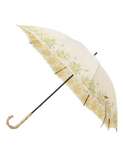 つば先のミモザ刺繍がポイントの日傘です。 ナチュラル感のある素材を使用し、上品な仕上がりです。 急な雨にも対応できる晴雨兼用です。 紫外線遮蔽率:90%以上 ※この製品は、太陽光線中の紫外線(UV)を通しにくくします。この効果は永久的ではありません。 ※照明の関係により、実際よりも色味が違って見える場合があります。また、パソコン・スマートフォンなどの環境により、若干製品と画像のカラーが異なる場合もございます。 店舗へのお問い合わせ商品番号:C70-41042 ●製品寸法: 00:全長64.5cm 直径80cm 持ち手14cm 親骨の長さ47cm 備考: