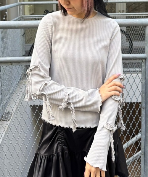 適度な肉感で1枚で着用しやすい、しなやかな肌触りのT/Rテレコ素材を使用したトップス。両袖のリボンディティールでアクセントをプラスしています。1枚ではもちろん、ワンピース等のインナーにも最適。同じ素材・ディティールを使用したフレアパンツを組み合わせていただくのもオススメ。スタイリングに取り入れやすい、アイボリー・グレー・ブラックの3色展開。1枚あると活躍する万能アイテムです。・アイボリー、ライトグレー、ブラック/黒の3色展開☆セットで可愛い、同シリーズのパンツは『1241708』で検索!【サイズ展開】・FREE(フリーサイズ)#カジュアル#ガーリー#リボン#インナー#レイヤード#キャンスト#キャンスパ#CND●Candy Stripper/キャンディストリッパー●-BRAND CONCEPT-NO RULE, NO GENRE, NO AGE年齢や性別にとらわれず、自由に自分を表現出来る服【お買い物をもっとお楽しみ頂くために】▼商品のお気に入り登録▼完売カラーの再入荷通知や、ラスト1点通知、プライスダウンしたセール通知も受け取れる♪▼ブランドのお気に入り登録▼新作や再入荷等、いち早くブランドのお得な情報が受け取れる♪