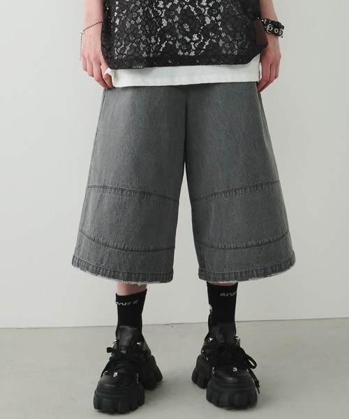【AIVER ワイドクォーターデニムパンツ】 通常よりややライトで通年で使いやすい11オンスのデニム生地を使用。硬すぎない柔らかい質感で裾に掛けてのシルエットが綺麗な仕上がり。 バイカーパンツの膝当てのような切り替えディティールを組み合わせたデニムパンツ。 ただの単色のシンプルなパンツではなく生地の切り替えでアクセントを加えたデザイン。 裾に掛けて大きく広がったワイドシルエットとひざ下のハーフ丈が特徴的。 裾部分はグラインダーで削ってダメージを加えた仕様。 ウォッシュのブラック、ブラックの生地をブリーチしたグレー、 グレーよりも更にブリーチを強くしたライトグレーの3色展開。 <問い合わせ番号/AC00000054/ACBLC251003> ※モデル着用画像つきましては、光の反射などによって実物と色味が異なって見える場合があります。商品物画像をご参照ください。 ※商品画像はサンプルの為、色味やサイズ等の仕様に変更がある場合があります。 ※一般の生地より色が落ちやすいため着用中、発汗、摩擦により脱色したり、他の衣類に移染する事があります。特に着用時のバックや衣類等の摩擦には、十分に注意して下さい。 ※繊維製品の為1~2cmの誤差がある場合があります。予めご了承下さい。 <商品のお気に入り登録> 再入荷、残り1点、セールなどの通知を受け取ることが出来ます。 <ブランドお気に入り登録> 新商品や再入荷、ショップのおすすめトピックスなど、