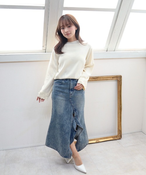 フリルのスリットがヘルシーに肌見せ◎スリットがあるので歩きやすい◎デザイン性のあるアイテムなので、1枚でコーデのポイントになります。