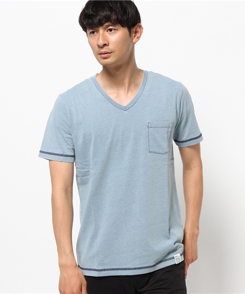 デニムのような雰囲気をかもし出すインディゴカラーのVネック半袖Tシャツです。袖口と裾にはカラーロックステッチ、胸元にはポケットを備えたシンプルながらもさりげなくこだわったデザインに注目。肌触りのいい天竺素材を使用しているので、ストレスなく快適に着こなせます。