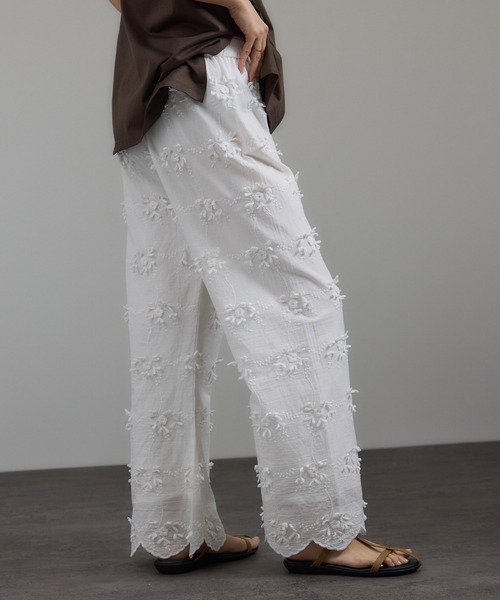 立体的なフラワー刺繍が目を惹く、セットアップとしても活躍するイージーパンツ■デザイン/シルエット立体的な刺繍レースが目を惹くセミワイドストレートパンツです。綿ローンの裏地付きで肌触りもよく、快適な着用感です。ウエストはオールゴムでリラクシーな印象に。着脱もスムーズ。裾はスカラップでアクセントに。デニムやミリタリーアウターとも好相性。■素材やわらかく繊細な綿ローンに葉のモチーフが浮き出すようなフラワー刺繍があしらわれた価値観のあるレース生地です。綿100%ならではの肌触りの良い生地で、吸水性に優れ、汗ばむ季節に最適な素材です。クリーンなオフホワイト、印象的なティールブルー、シックなブラックの3色展開です。ご自宅で手洗い可能なのも嬉しいポイント。■コーディネートベーシックなTシャツスタイリングも華やかにアップデートしてくれます。同素材のレースジレブラウス、レースジャケットとセットアップのスタイリングも◎■3Dレースシリーズ一覧・商品番号:SHH25010 商品名:【WEB限定】3Dフラワーレースブラウス・商品番号:SHS25010 商品名:【WEB限定】3Dフラワーレースパンツ・商品番号:SHV25010 商品名:【WEB限定】3Dフラワーレースジャケット■モデル身長:174cm 着用サイズ:Fーーーーーーーーーー裏地:あり光沢感:なし透け感:なしウエスト:ゴムポケット:なし伸縮性:なし生地の厚さ:薄手ーーーーーーーーーー