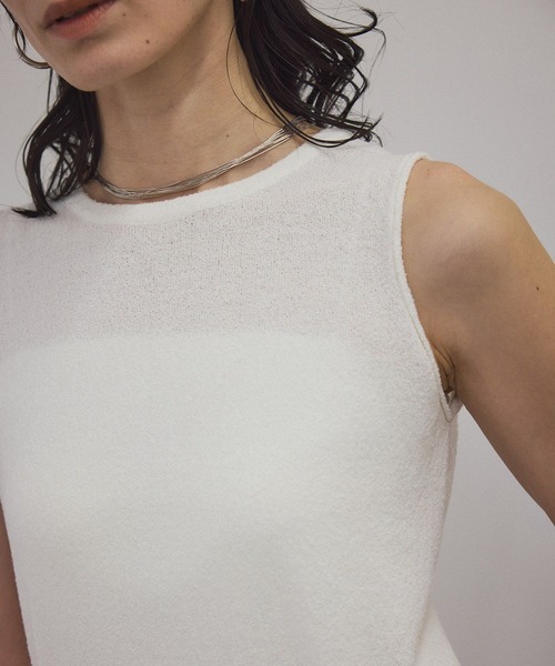 ほどよいゆとりと伸縮性が嬉しい、大人のためのノースリーブトップス■デザイン/シルエットスリットが抜け感をプラスしてくれる、さらりと着こなせるループヤーンノースリーブニットです。気になる腰やヒップ周りも体型カバーしてくれる丈で、程よいあきのネックラインは顔周りをすっきりと見せてくれます。二の腕が気になりにくい肩巾に設計しております。袖口のカール仕様もポイントです。後ろのピンタックがアクセント。■素材繊細なループヤーンを使用したパイルのような表情が印象的な編地です。さらりとしたタッチで心地の良い着用感です。天竺編みで涼やかな印象に。クリーンなオフホワイト、肌映りの良いテラコッタ、シックなブラックの3色展開です。ご自宅で手洗い可能なのも嬉しいポイント。■コーディネートいつものタンクトップ代わりに差し込むだけで洗練された着こなしに。ワイドシルエットのパンツやボリュームスカートとも好相性。同素材のショートカーディガンとのセットアップもおすすめです。■セットアップで着用可能な同素材のショートカーディガンもございます。 商品番号:SHK25020商品名:【WEB限定】ループヤーンリブショートカーディガン■モデル身長:174cm 着用サイズ:Fーーーーーーーーーー裏地:なし光沢感:なし透け感:ホワイトややあり伸縮性:あり生地の厚さ:薄手ーーーーーーーーーー