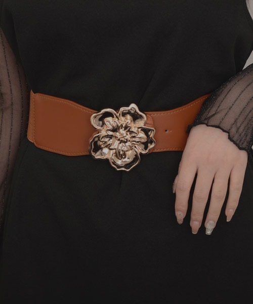 \コーデのアクセントに!/ゴールドのフラワーバックルが特徴的なゴムベルト太めのデザインで、ウエストマークするとスタイルアップ効果が期待できます。普段のコーデに取り入れるだけで、いつもと違った雰囲気に♪・結婚式やパーティなどのオケージョンシーンに・普段のお洋服にプラスワンに・ゆったりとしたお洋服のウエストマークに・シンプルなコーディネートのアクセントに・お友達と色違いでリンクコーデにドレスなどのきれいめコーデから、Tシャツスタイルのカジュアルコーデまで何通りも楽しめるマルチウェイアイテムです。【サイズ】■長さ:約67.5cm 幅:約6.8cm”アイテムと自分と共振した時に、個性が輝やく”テーマのresonance。デザイン、ジャンルにとらわれない品のあるアイテムをセレクト。