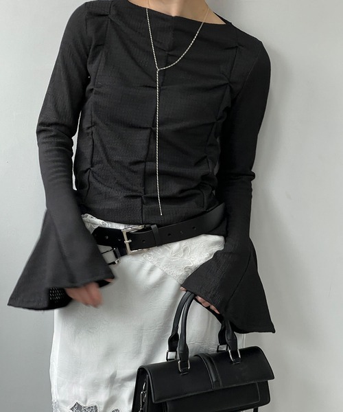 立体感のあるシルエットで魅せる大人のニュアンストップスフロントに施されたタックデザインが、洗練された立体感を生み出すロングスリーブカットソー。 透かし編みのような小さな穴が空いた独特の生地は、繊細ながらも存在感のある表情を演出。 袖口に向かって広がるフレアスリーブが女性らしい抜け感もプラス。 柔らかく伸縮性のある素材で、軽やかな着心地も魅力。 1枚ではもちろん、ベストやビスチェとのレイヤードスタイルにもおすすめ。 詳細補足 仕様:かぶり着用 伸縮性:あり 透け感:あり 光沢:なし 裏地:なし 厚さ:普通 サイズ感:通常 instagram→chuclla_official 取扱注意事項 ※サイズは、測定方法と測定者によって多少の誤差がありますのでご了承下さいませ。 また体型によって、サイズ感に個人差がございます。(平置き採寸) ※商品によってはシワがつきやすく、畳みジワや折りジワなどが強く出る場合がございます。 その際は加湿した風呂場に数時間干すか、スチームアイロンでのお手入れをお勧めしております。 ※生地の素材上、においが気になる場合がございます。 その際は陰干しして頂くと、ほとんど感じにくくなります。 ※レース等の繊細な素材を使用している場合には、お取り扱いにご注意下さい。 ※デニムを使用した製品は、インディゴ染めをしています。 汗や摩擦により移染しやすいので、白色、淡色の組み合わせや重ね着はお避け下さい。 ※ニット素材を使用した製品は、重みで伸びやすくなりますのでハンガーでの保管はお控えください。 ※お洗濯の際には、品質表示の指示に従ってください。必要であれば専門店にご相談ください。 家庭でご洗濯できる商品に関しては、洗濯専用ネットをご使用の上、個別での洗濯をお勧めいたします。 お色物は、色移りする可能性がございます。 ※着用画像は撮影状況や光によって、多少異なる場合がございますので、置き画像をご確認下さい。 ※2023年7月1日より、環境に配慮した取り組みの一環として、紙のアテンションタグを廃止しております。