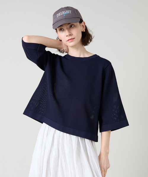 コンパクトなシンプル横長シルエットのトップス。 スポンジーな合繊糸を多本どりしてメッシュ編みしました。軽さと張り感、程よいストレッチがポイントです。 ボクシーなシルエット、広めの袖もポイントとなっております。表情があるメッシュ柄をで仕上げました。前後2WAYで着用可能。カーディガンとしても着用いただけます。 ※サンプル撮影のため実際の仕様と異なる場合がございます。 予めご了承ください。 ■透け感 ややあり ■伸縮性 あり ■光沢感 なし ■裏地 なし ■生地の厚さ やや厚い