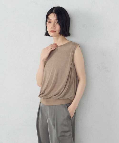 《デザイン》シンプルながらも様になるノースリーブTシャツ。肩巾を広めにして一枚着としても着用可能にしました。ネックラインは詰まり過ぎないクルーネック。ネックラインと裾にリブを使ってスッキリ仕上げました。スタイリングしやすいナチュラルなベーシックカラーの4色展開です。カジュアルにも通勤着としても着られる優秀なアイテムです。《素材》生地の光沢が特徴的なジャージー素材です。伸縮性があり、シワにならないのも嬉しいポイント。しなやかな落ち感があり、肌触りが良く着心地が良い素材です。衿部分にはストレッチの効いた上品なテレコを使っています。取り扱いやすく、イージーケアが可能でデイリー使いにおすすめです。……………………透け感:ややあり厚さ:普通伸縮性:あり光沢感:あり裏地:なし洗濯方法:洗濯機(弱)可……………………※画像の商品はサンプルとなりますので実際の商品と仕様、加工、サイズが若干異なる場合がございます。※こちらの商品はFIVE FOXes独自の採寸方法となっています。本サイトのサイズガイドと採寸方法が異なる場合がありますのでご了承ください。