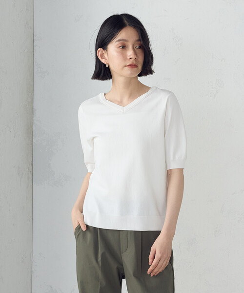 \洗えるからデイリー使いも◎、オフィスでもきれいめに着られて便利/《デザイン》夏の紫外線対策に!UVカット&洗濯機洗いOKのサマーベーシックニット。通勤~日常使いに幅広く使える5分袖ニットです。さらっとした肌触りで春夏に快適な素材です。目面が綺麗な天竺編みのハイゲージニットです。特徴は前後着用できる2WAYネックデザインです。クルーネックとVネック両方着れて着回し出来る、クルーネックは細幅の衿リブを付けたすっきりとした衿。Vネックは衿もとは深すぎないやや浅めのVネックです。夏の通勤トップスにぴったりなトップスです。程よくゆとりがあり、一枚着でも着やすいサイズ感です。二の腕を優しくカバーする5分袖丈です。《素材》UVカット&洗濯機洗いOK!UVカットの機能付きの目の詰まったハイゲージニット。チクチク感のないさらっとした肌触りで、しなやかな落ち感があります。洗濯機で洗えてイージーケア出来ます。《アンサンブル対応》同素材のカーディガン(品番:12-74KK03-205)とアンサンブルとしてお召しいただけます。……………………透け感:あり厚さ:普通伸縮性:あり洗濯方法:手洗い……………………■気になる商品はお気に入り登録をおススメ■▼商品のお気に入り登録完売アイテムの再入荷通知、ラスト1点、またクーポンやお値下げ通知をお知らせします。▼ブランドのお気に入り登録新作アイテムの入荷や人気アイテムの再入荷、タイムセールやクーポンなど、いち早くブランドのお得な情報を受け取ることができます。※画像の商品はサンプルとなりますので実際の商品と仕様、加工、サイズが若干異なる場合がございます。※こちらの商品はFIVE FOXes独自の採寸方法となっています。本サイトのサイズガイドと採寸方法が異なる場合がありますのでご了承ください。