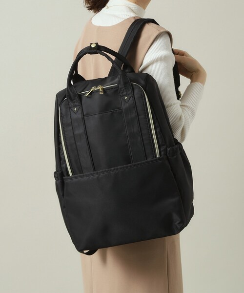 【デザイン】 撥水加工を施した生地を使用した大容量10ポケットリュックが登場。 軽くて張りのある生地なのでしっかり自立◎ 大きくガバッと開くメイン収納は幅広マチなのでお弁当箱なども傾きにくくしまえるのが嬉しいポイント! 背面には旅行時に便利なセキュリティーポケット付きで、キャリーオンも可能です。 通勤や通学はもちろん、一泊旅行やマザーズバッグとしても幅広く使えるデイリーアイテムです。 【機能性】 A4サイズが収納可能。 PCやタブレットの収納に便利なクッションポケット付き。ボトルホルダー付き。 ※ポケット数×10 完全防水ではありませんので縫製部分やファスナーから水が浸入することがあります。ご注意ください。撥水効果は永久的なものではなく、徐々に低下しますので、市販の撥水スプレーのご利用をおすすめします。 ※照明の関係により、実際よりも色味が違って見える場合があります。また、パソコン・スマートフォンなどの環境により、若干製品と画像のカラーが異なる場合もございます。 店舗へのお問い合わせ商品番号:P93-72026 ●製品寸法: 00(フリーサイズ):高さ40cm 幅(上部)23cm 幅(下部)28cm マチ13cm 持ち手上がり9cm ショルダー対応サイズ75~93cm 備考:重量:約565g