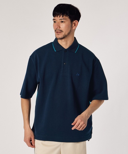 100%MVSコットン 度目を詰めたコットンヘビーピケ素材 ワイドボックスシルエット ボリューム調整できるドローストリングヘム 両脇にワイドニットテープのサイドライン入り 配色ライン入りのポロカラー キャッツアイボタンのプラケット 左胸に”Marguerite”のワンポイント刺繍