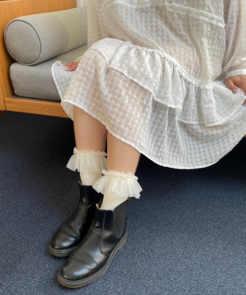 COMMENT□チュールがドッキングされたクルー丈ソックス□コーディネートに合わせやすい定番カラー□足元のポイントとなるアイテム□フリルは折り返しても立たせてもかわいい2WAYATTENTION□商品写真はご利用のモニター環境や照明により、実物と色みに差異が生じる場合がございます。□商品画像はサンプルのため、色味やサイズ等の仕様に変更がある場合がございますので、予めご了承ください。□商品によって同サイズや同色等であっても各商品毎に誤差が生じる場合がございます。□サイト上のカラー名と、お届け商品に記載されているカラー名が異なる場合がございます。【RUBY AND YOU-select items-】RUBY AND YOU が提案する "ガーリーシック" なムードにマッチするファッションアイテムを厳選してセレクト。